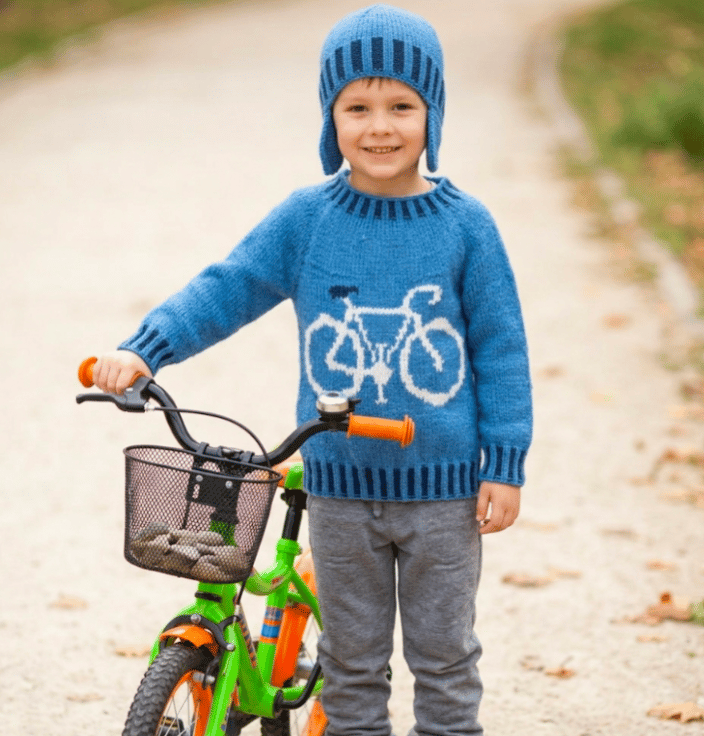 The sweater features a bicycle on the front and ribs knitted in 2 x 2 rib with main and contrast yarn. The hat has flaps to keep those ears warm whilst cycling!