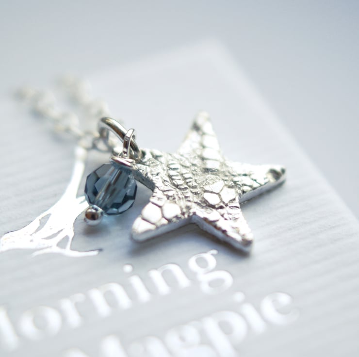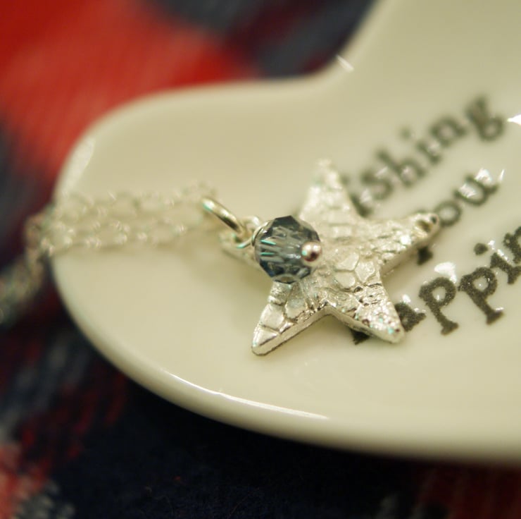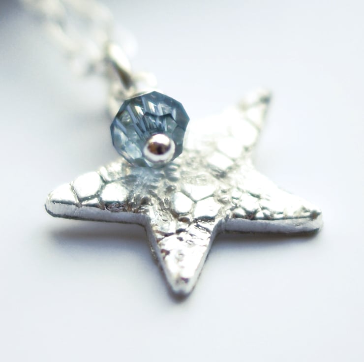A fine silver star with a lace impression hangs from this silver chain, along with a gemstone of your choice! Image shows a blue Swarovski crystal, but other favourites include freshwater pearl, rose quartz or perhaps a birthstone. Feel free to ask for something specific as I may have it.