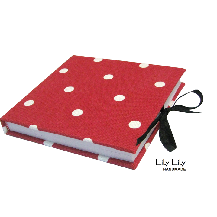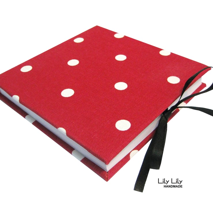 A hardback notebook hand covered with gorgeous vibrant red spot fabric. Pages are quality white paper and unlined. The notebook has a black ribbon fastening. Perfect for making notes, sketches or as a journal. Size of the notebook is approximately 14.5cm x 14.1cm. x 2.3cm depth.