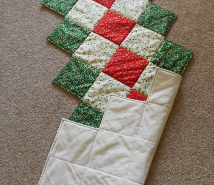 I've made this 127cm (50 inch) table runner using quality 100% cotton fabrics. The delicate holly leaves and stars are all edged with gold adding a subtle sparkle to this table centre piece. I have quilted between the squares of fabric to give depth to the fabric which is lined with 100% cotton batting and backed with calico.