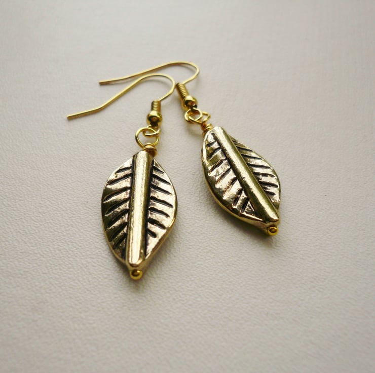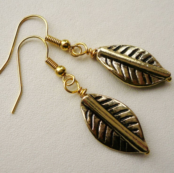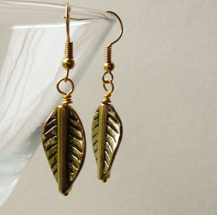 These earrings are nice and simple consisting of 20mm long gold tone metal leaf charms hung on gold plated ear hooks. They measure approx 4.5cm incl ear hook.
