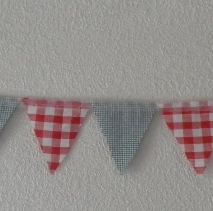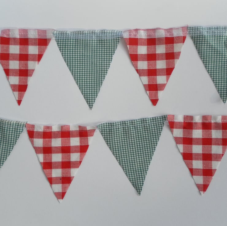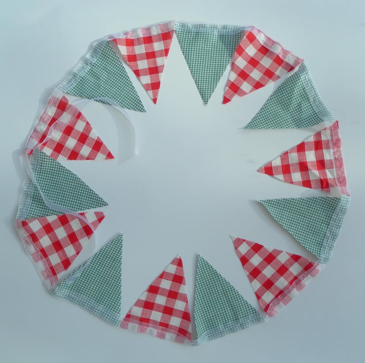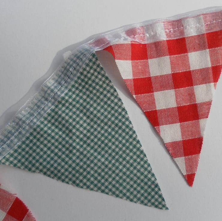 This Christmas bunting is just over 1.3m long (plus ribbon for tying), with 14 pennants, using 2 different, festive coloured gingham fabrics. The pennants are 9cm x 11.5cm and are single sided, with raw edges, sewn onto white organza ribbon.