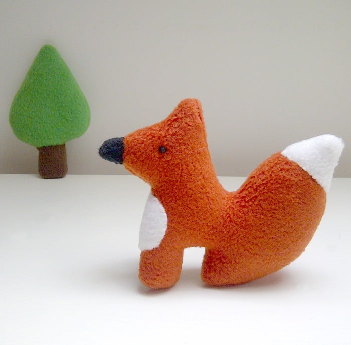 Made from a lovely russet coloured fleece, I have added white fleece detail on foxy's chest and tail, sewn into the seams and then hand stitched arond the edges. I've securely sewn on a squashy, black fleece nose. The eyes are sewn using black embroidery thread.