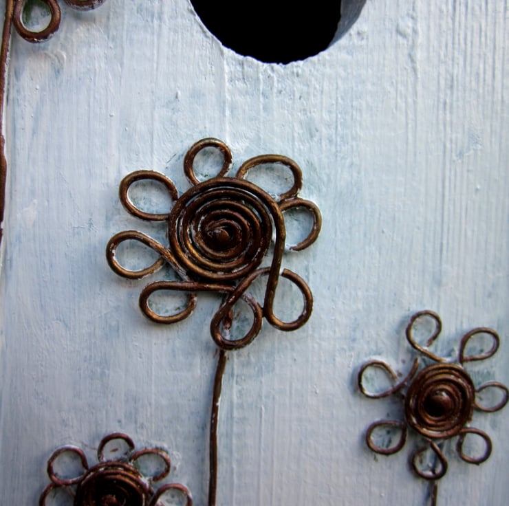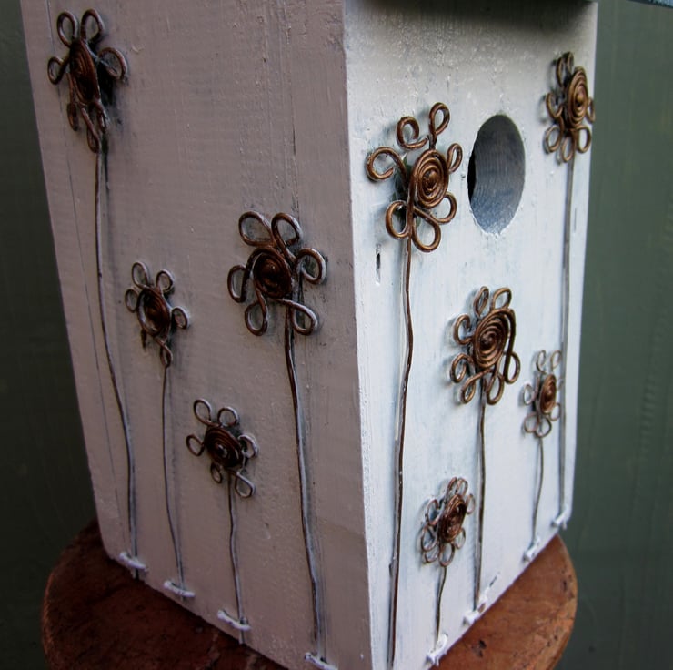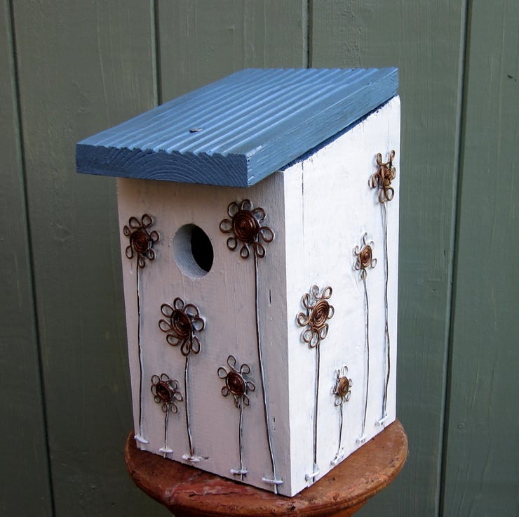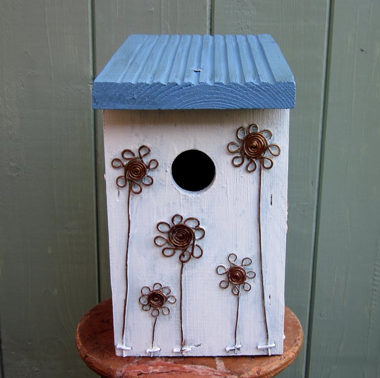 This hand decorated bird box in white and blue has a slight distressed finish made with layers of paint. Next the whole nest box has had stylised wire seed heads added. These have been painted to give a copper / rust effect and the paint has been fixed to make it durable. The finished effect has a lovely rustic feel.