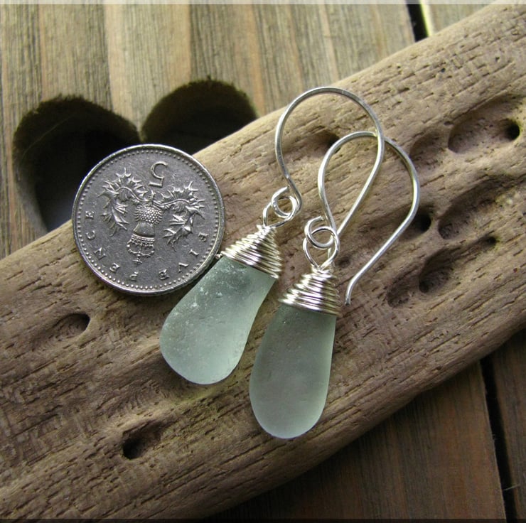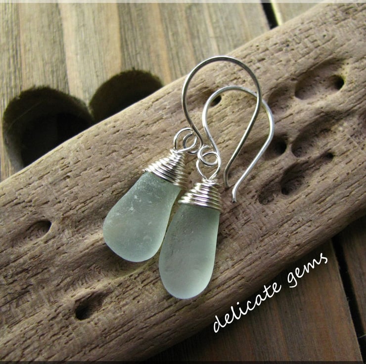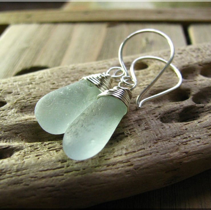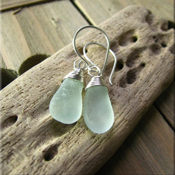 Beautifully frosted pale aqua sea glass drops drilled and wired onto non-tarnish wire. The earring hooks are handmade from 0.8mm sterling silver wire.