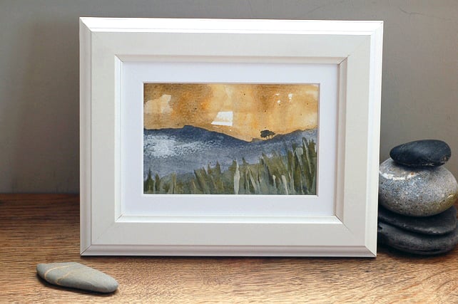 This is a small original landscape painting of an upland landscape in lovely warm tones of ochre and blue