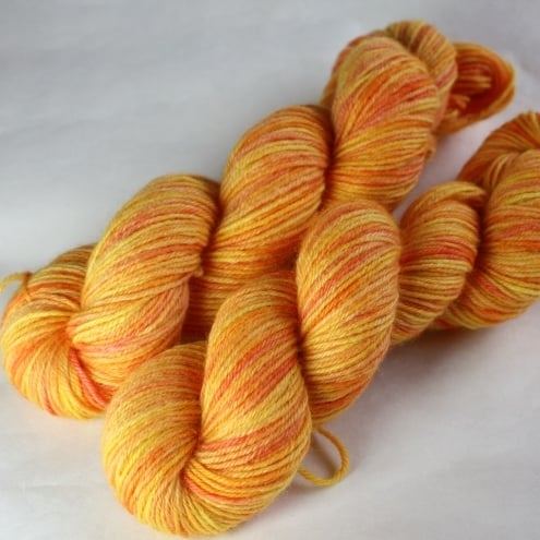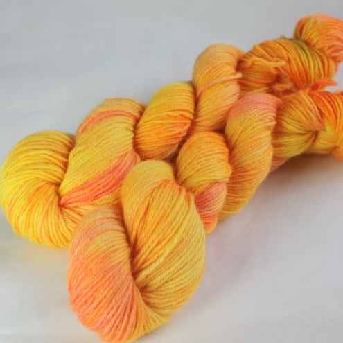 I think sunshine and orange juice best describes the colour of this yarn. It is reskeined as shown in the first two photographs but is shown before reskeining in the third photograph for reference only. There are two skeins available (price shown is for one).