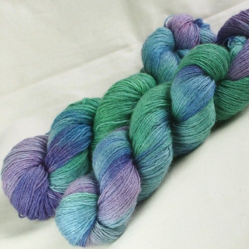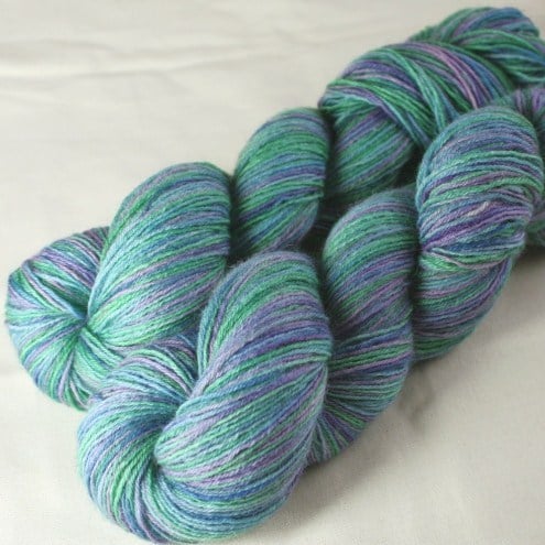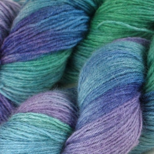 This yarn reminds me of a field of corncockles, forget me nots and other light blue, lilac and purple flowers. The yarn is reskeined as shown in the first two photographs but is shown before reskeining in the third and fourth photographs for reference only. The green in the photographs is slightly 'off' and has a slightly more yellow tone in reality. There is one skein left.