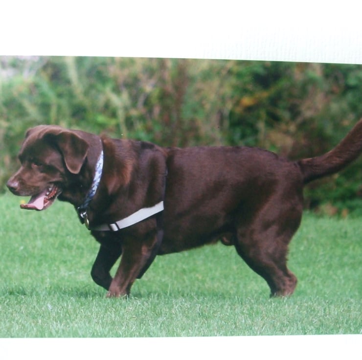 6" x 4" Photo on a card of a chocolate Labrador panting . This photo is mounted on cream card with a a blank inner; an envelope is supplied. The 3 photos shown are 1st. photo mounted on a card; 2nd. the actual photo 15cm. x 10cm.; 3rd. a square version, 9 cm.sq. that can be in an acrylic coaster, with a matching card for £5.50 plus £2.75 postage.