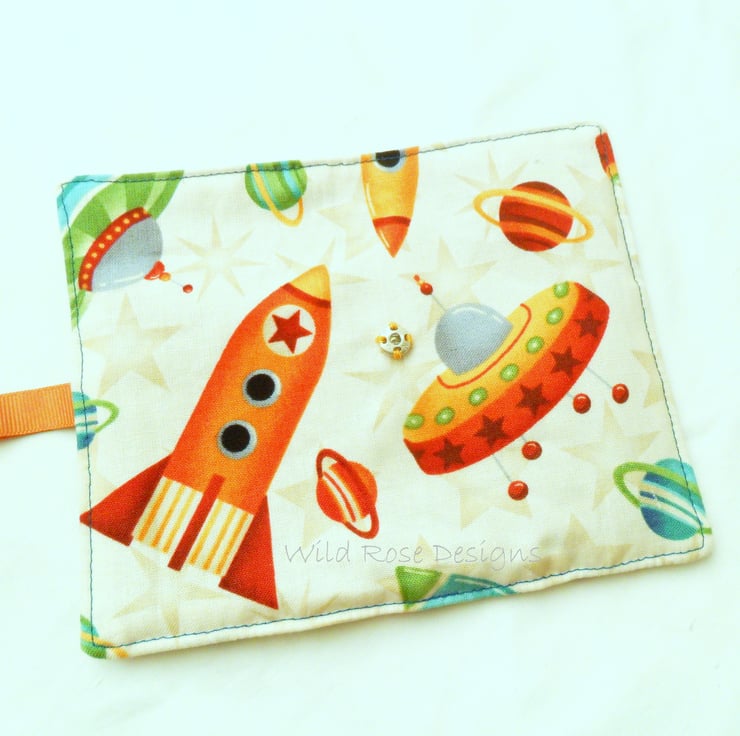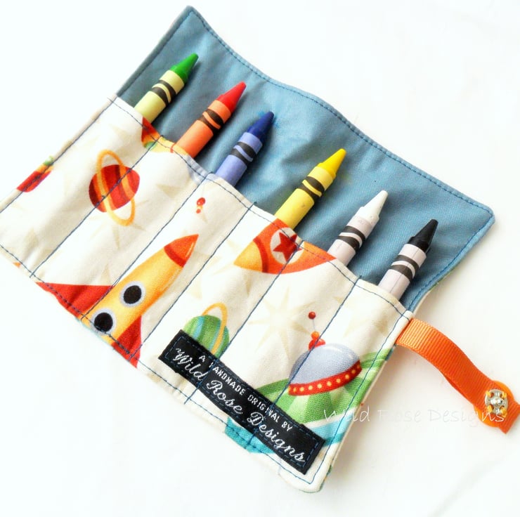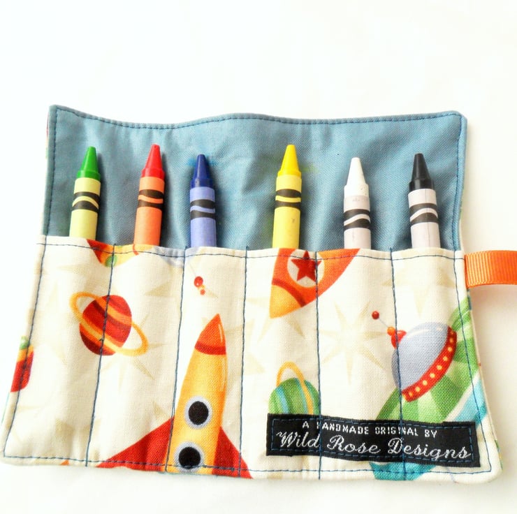 Made in a cute rocket print cotton and lined in teal glazed cotton, this mini pencil roll holds 6 wax crayons or mini pencils and fastens with a press stud on an orange gross grain ribbon. It comes complete with 6 free Crayola wax crayons. Keep your kids occupied in restaurants and cafes by popping one in your bag along with a small colouring book - colours may vary.