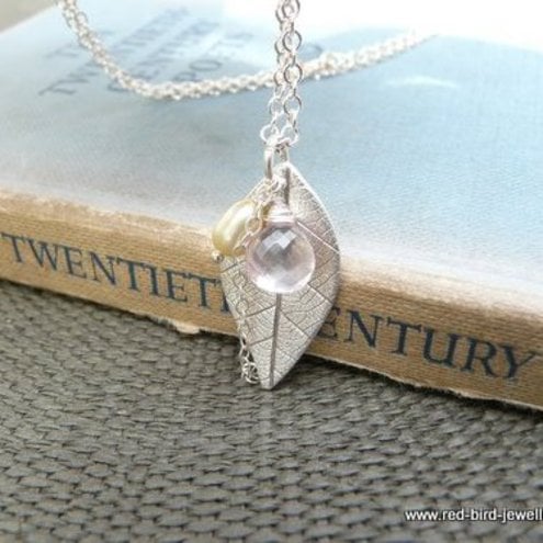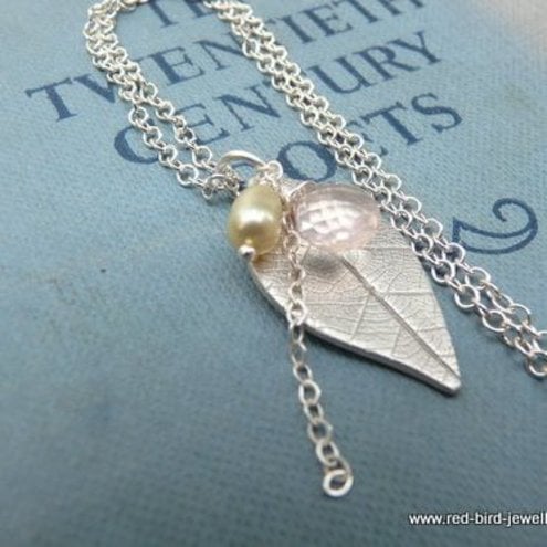 The colours of spring in a pendant. A textured fine silver leaf (nearly 3cm long and about 1.5cm width) hangs from a sterling silver 18inch chain.