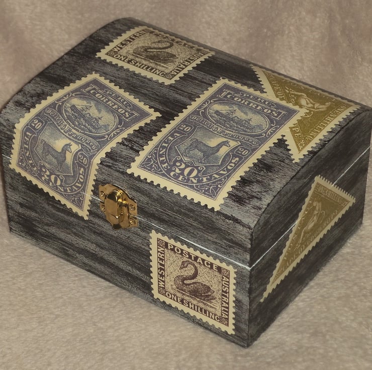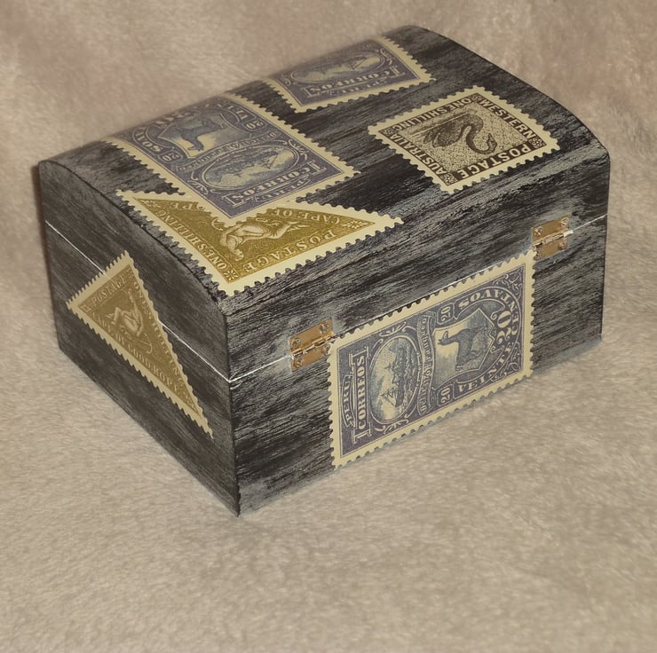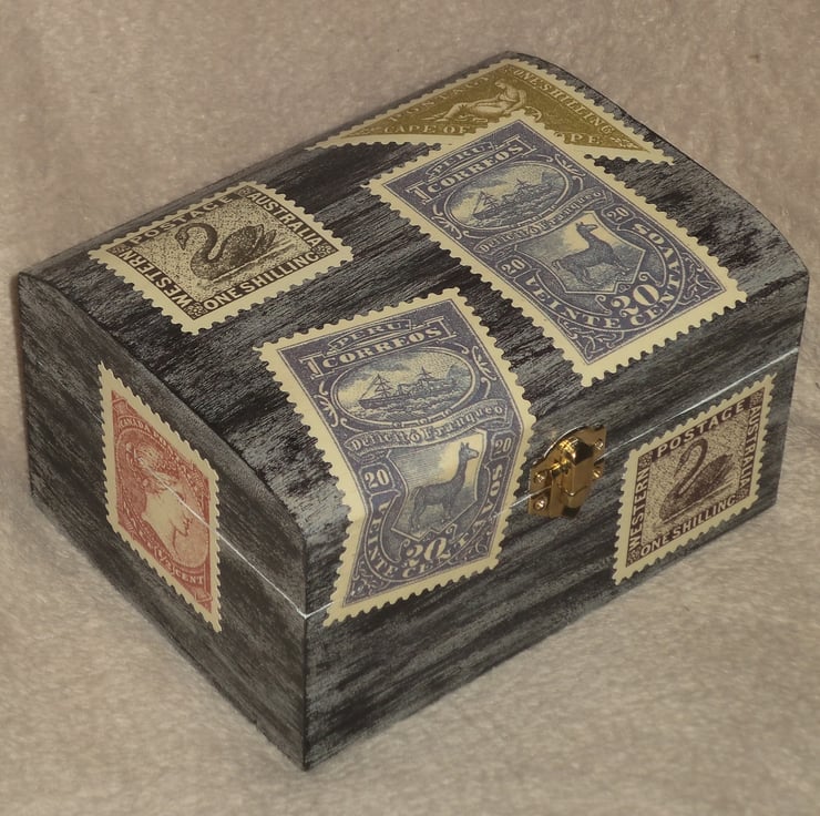 The box would obviously suit the stamp collector but has a vintage and multi-purpose storage feel making it very suitable for storing Memories (especially travel, such as postcards and tickets), stationery or jewellery - or anything that the owner wishes!