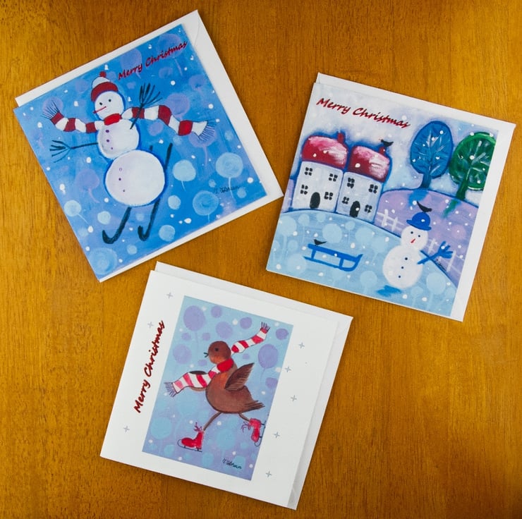 Designs after original paintings titled: Winter Joy, Winter in Devon and Robin on Ice.