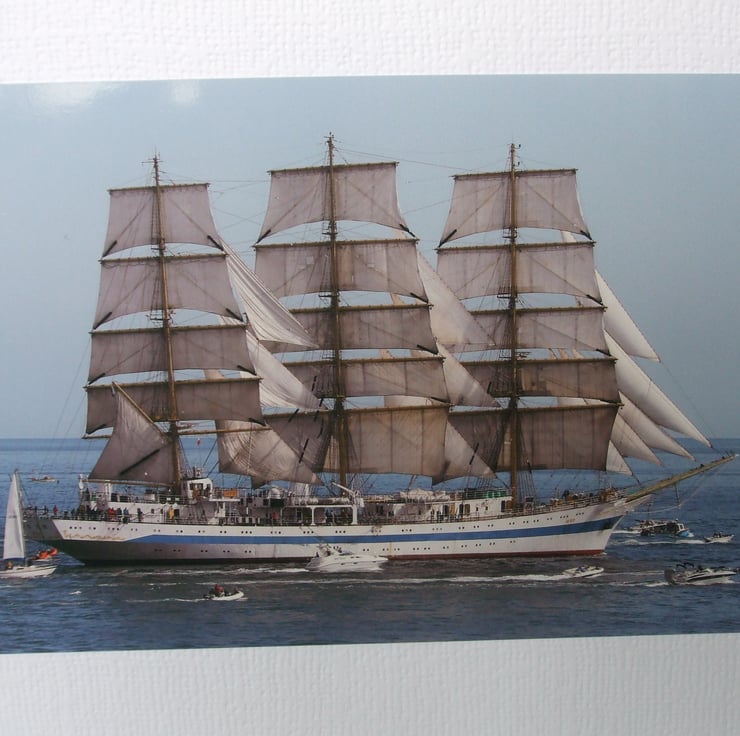 This greetings card has a photo of "Mir" a 94.8m. Fully Rigged Tall Ship; it is mounted on white textured card with a blank inner. An envelope is also supplied.