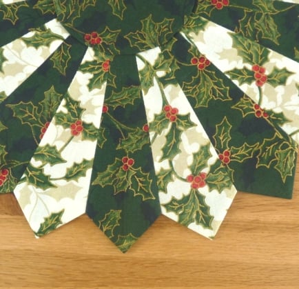 This lovely handmade Table Mat is made from a Cream Festive Cotton Fabric and a Bottle Green Festive Cotton Fabric. I have machine stitched around the outer edge of the mat with Gold thread which attaches the felt backing to finish it of neatly. Its made up of 20 sections all sewn together to form this lovely mat which can be used in the center of a coffee table or dining table.