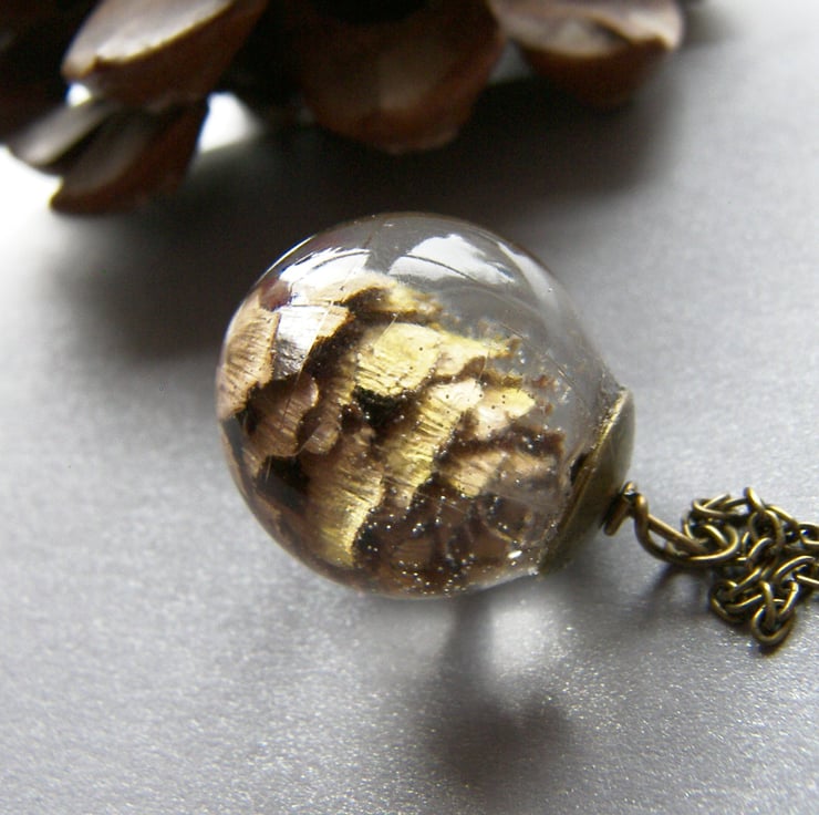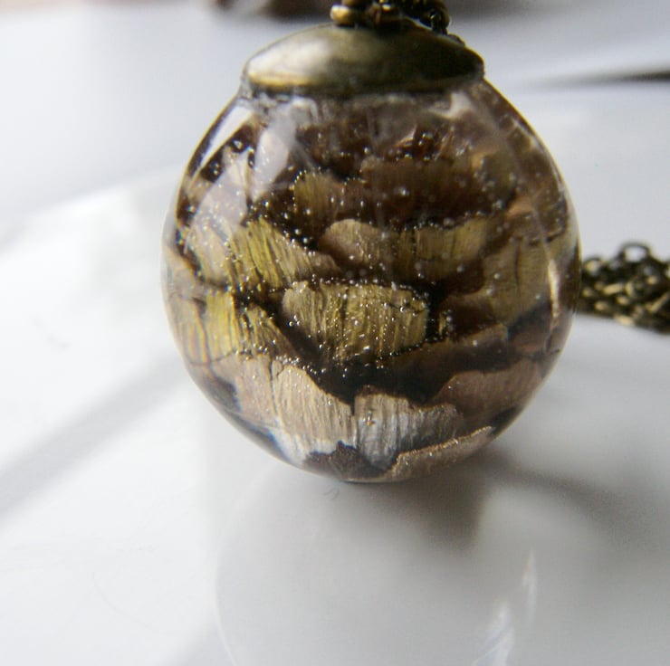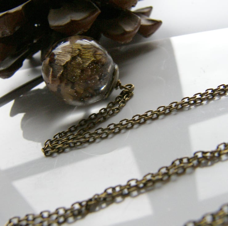 Description: I have very carefully sealed this little pine cone in crystal clear, eco friendly, non toxic uv resistant resin. This large orb measures around 25mm, (approx 1") I have capped with a lovely antique bronze plated cap and hung on an extra long 30" antique bronze plated chain. If you prefer shorter chain message me..