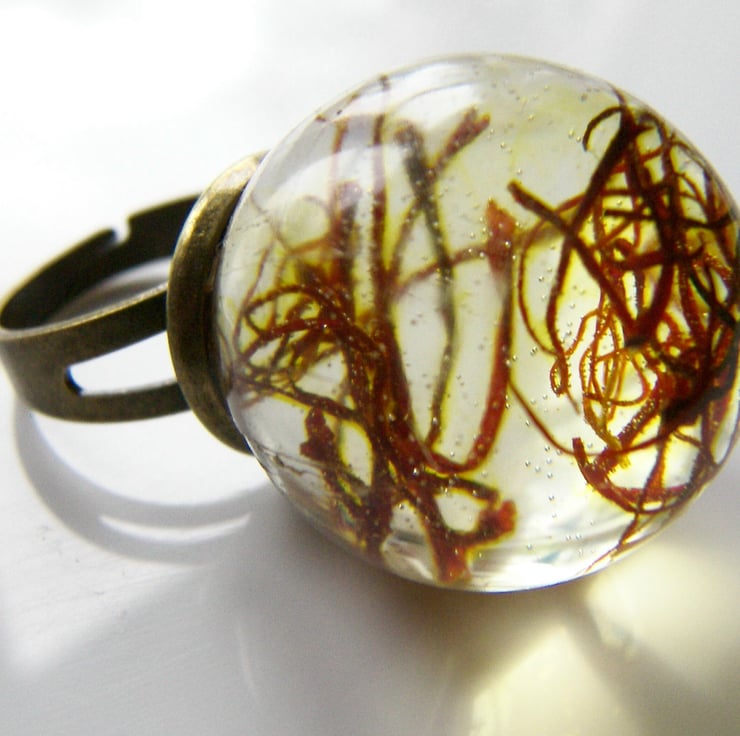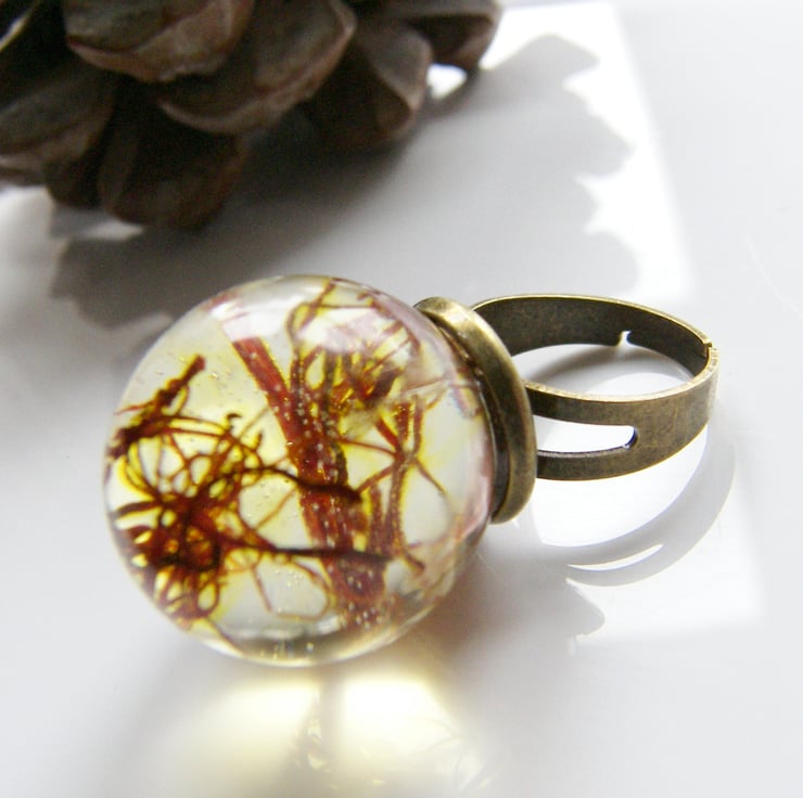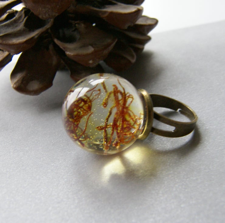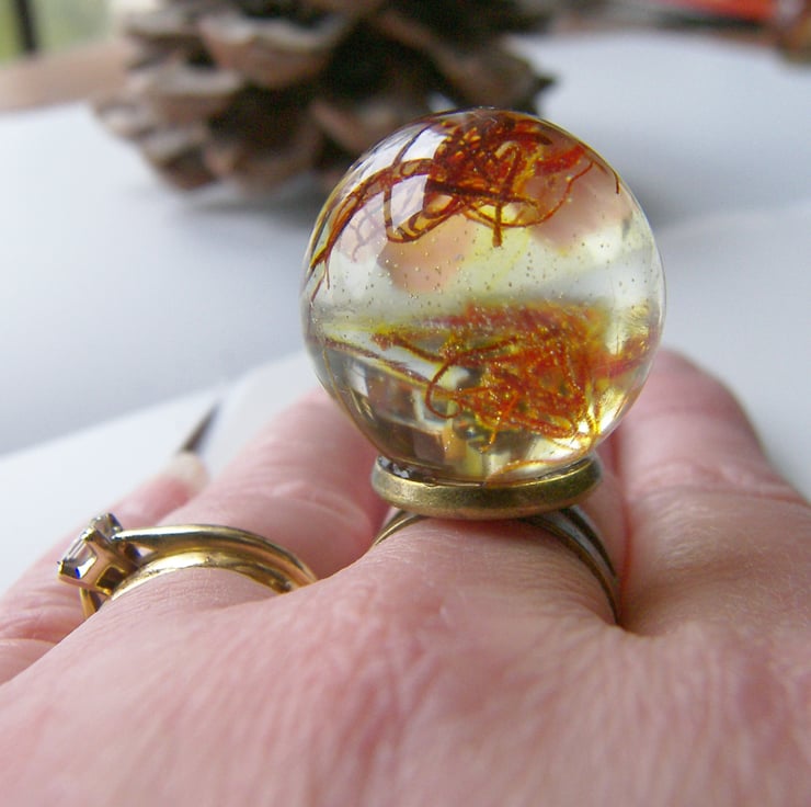 Description: Real Saffron encapsulated forever in a crystal clear resin ball, non toxic uv resistant resin. This large orb measures around 25mm, (approx 1") I have mounted the orb on a bronze plated expandable ring, would make a beautiful gift, perfect for any cook, chef or someone who loves to cook:) The effect of the saffron in resin is stunning, mezmerizing!!