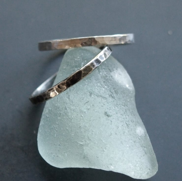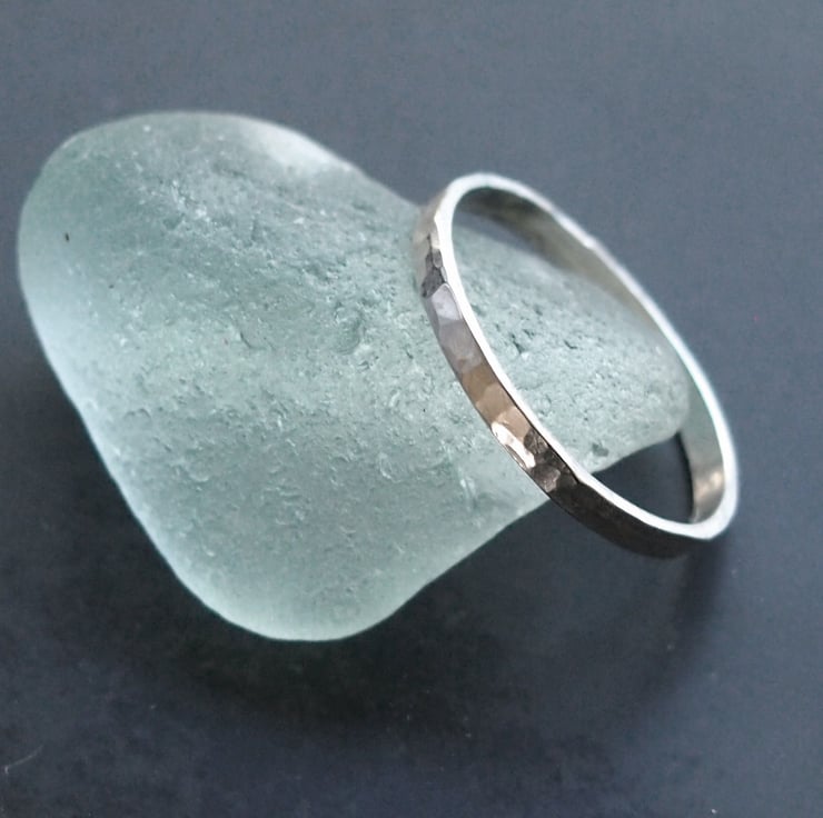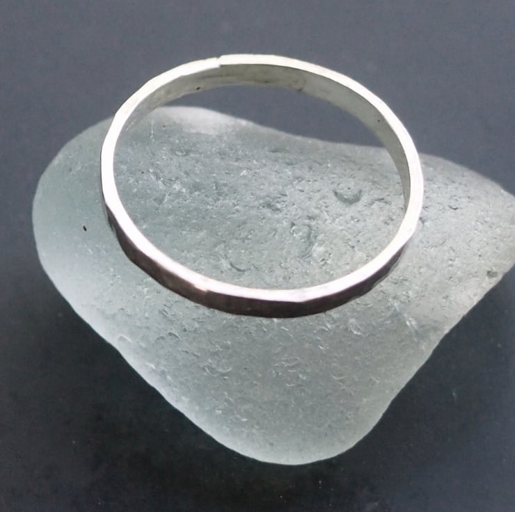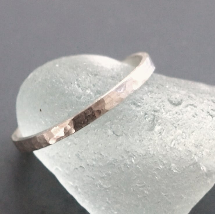 A sterling silver ring with a hammered surface texture made with 2mm deep and 1mm thick sterling silver sturdy enough to be worn every day. This can also be oxidised to give an aged effect (see the final photo) If you would like an oxidised finish please message me otherwise the bright polish finish will be sent.