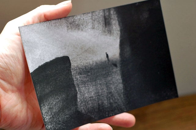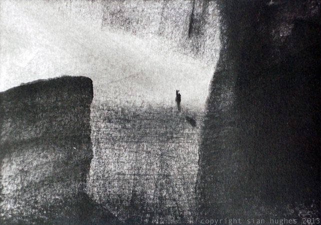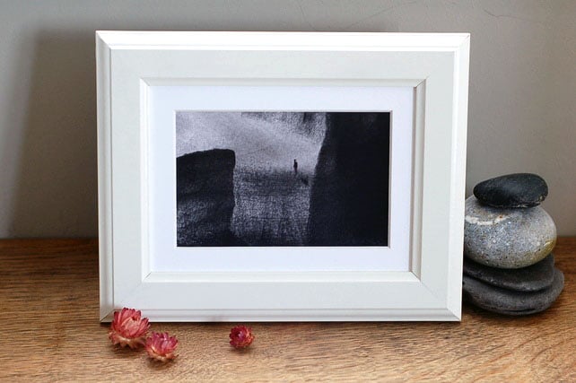 This is one a series of original paintings depicting a solitary walker casting their shadow between two tors or rocky outcrops in a moorland landscape. It is created by applying black pigment ink onto drawing paper using sponges and stencils.