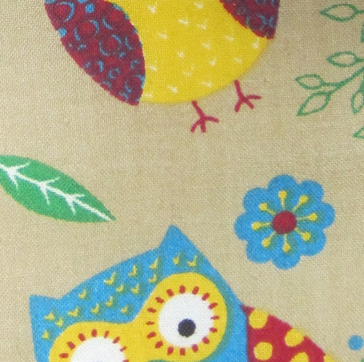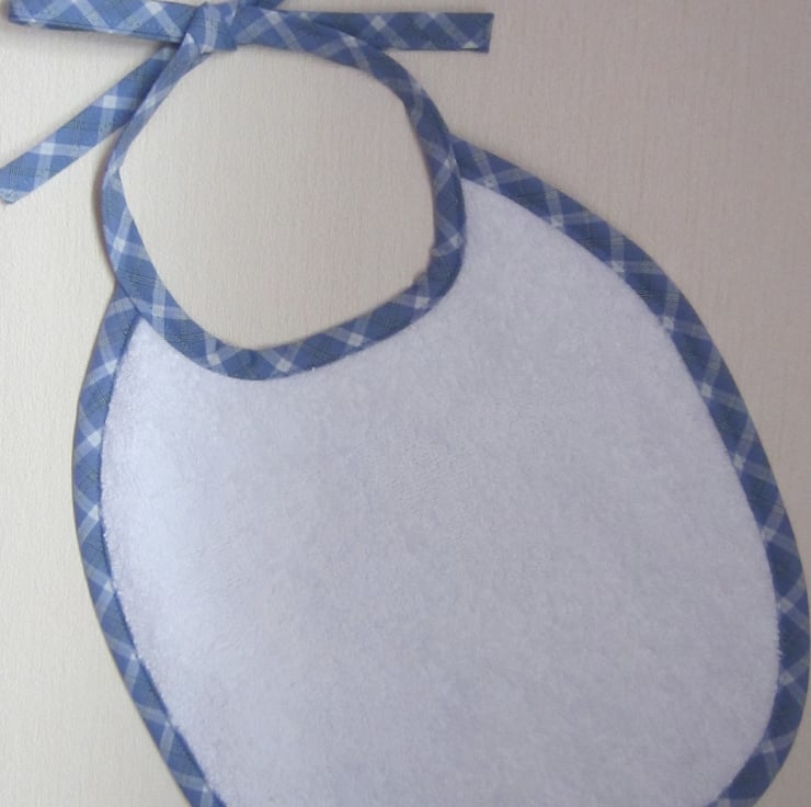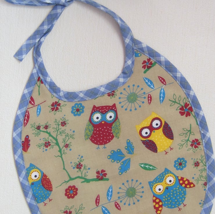 Small size babies bib in owl fabric edged in blue check and backed with white towelling. Suitable for babies aged about 6 to12 months. Ties at neck with a bow. Measures 23.5 cm wide and 27 cm long.