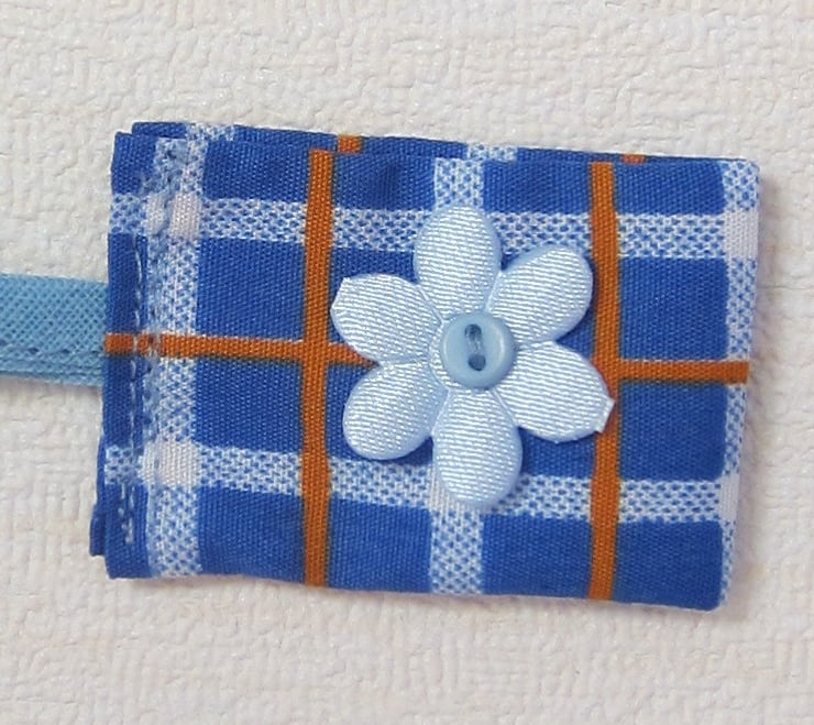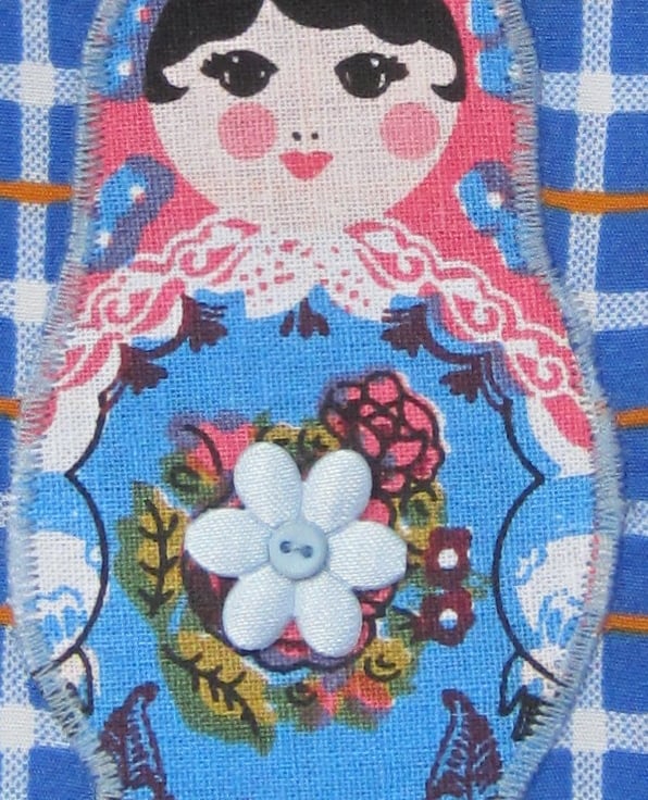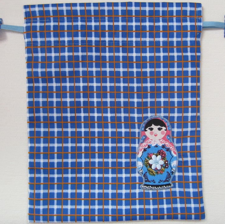 Drawstring bag in blue check decorated with an appliqued Russian doll and flower and button embellishments. Lined with showerproof fabric. Useful for toiletries, make-up, babies bits and bobs etc. Measures 22.5 cm wide and 28 cm long.