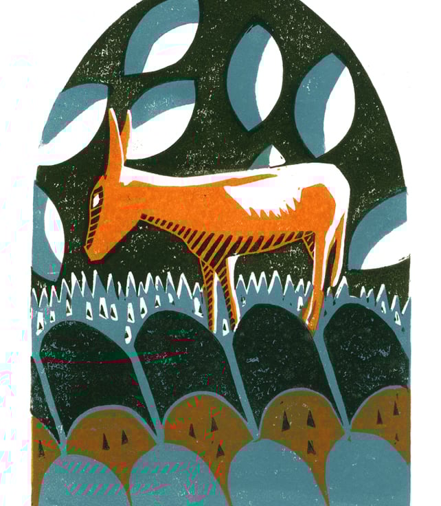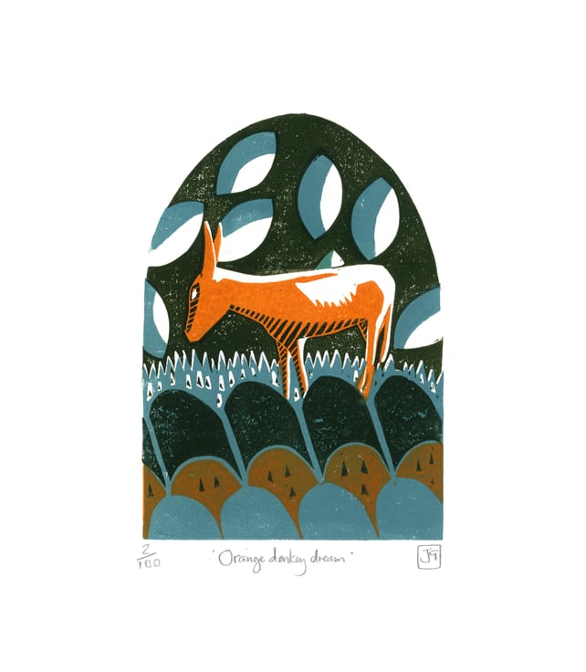 A 3-colour linocut print entitled 'Orange Donkey Dream'.