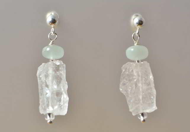 These stunning earrings feature delicate pillows of Grade A Aquamarine on top of rough cut chunks of clear quartz. All the earring findings are 925 sterling silver.