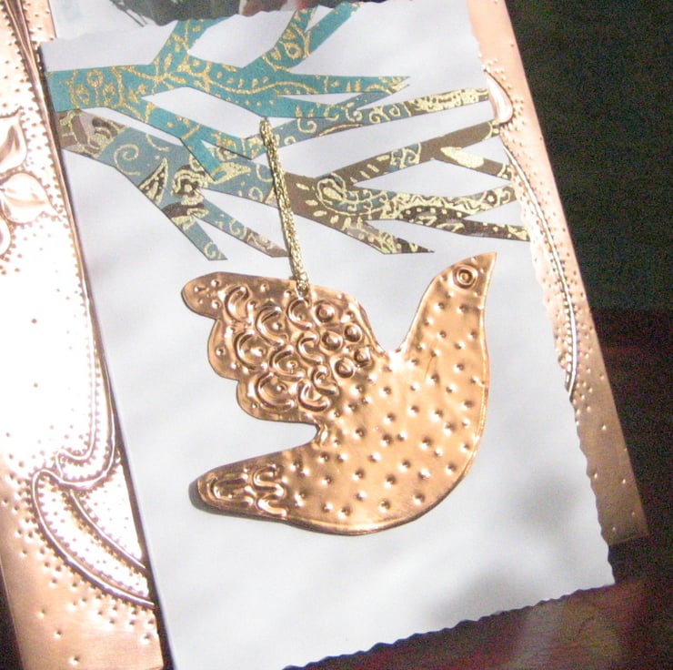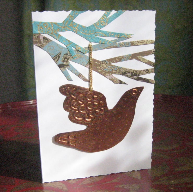This deckle-edge card has been decorated with hand-cut paper and features a removable copper decoration which has been handcrafted and lacquered . Blank for your own message, The card measures 150 x 105mm and comes with an envelope. Ideal for Christmas, Birthday, Wedding, Valentine's Day and many other Special Occasions.