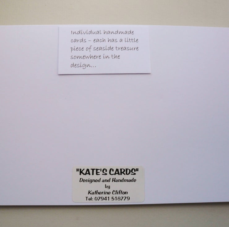 'Seaside treasure' comes in the form of genuine small sea shells or pieces of sea glass which have been collected by myself mainly from Devon beaches, this makes each card different and individual.