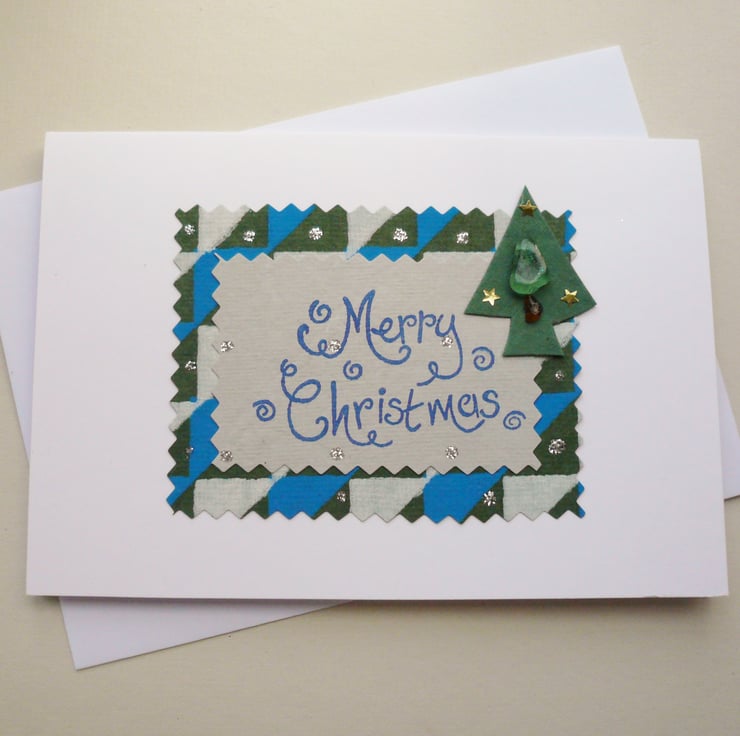 Hand printed christmas text mounted on handmade papers with decorative handpaper tree with genuine sea glass 'tree' embellishment