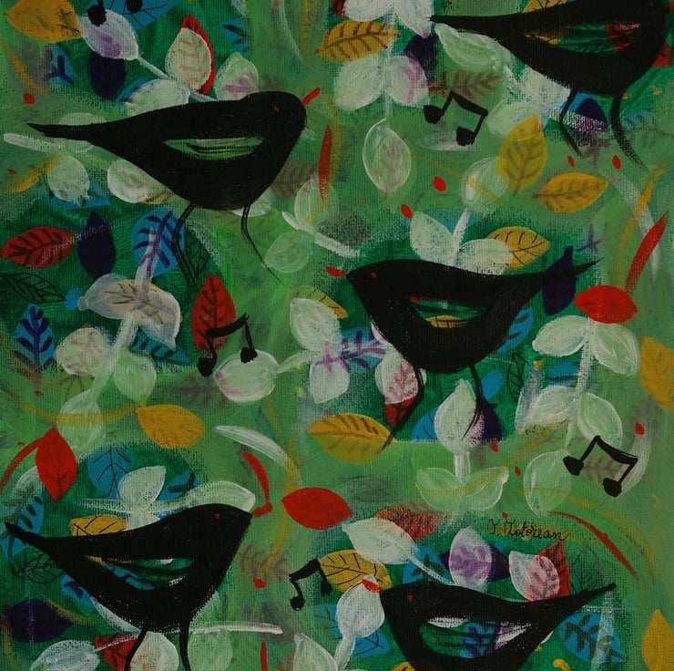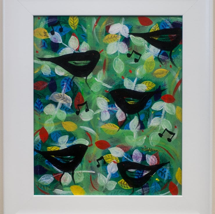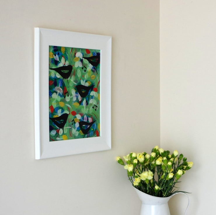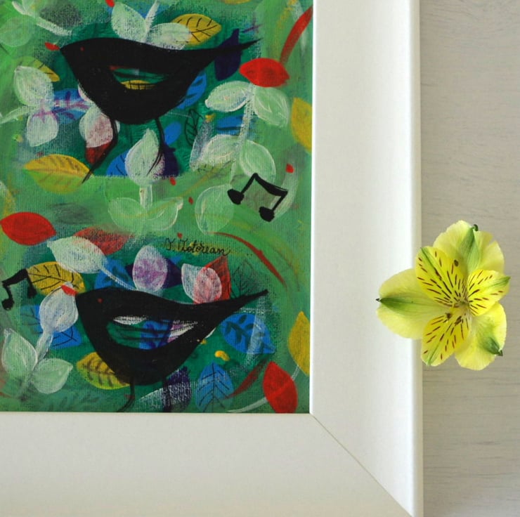 Original painting titled "Enjoying the Spring" created in acrylic on canvas board, framed with a white frame, varnished for protection and ready to hang. The size with the frame is 13.5" x 15.5". The design was chosen by Mulberry Tree Cards to be part of their range of cards.
