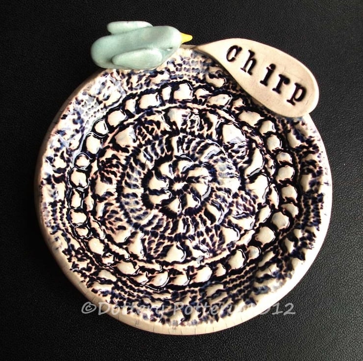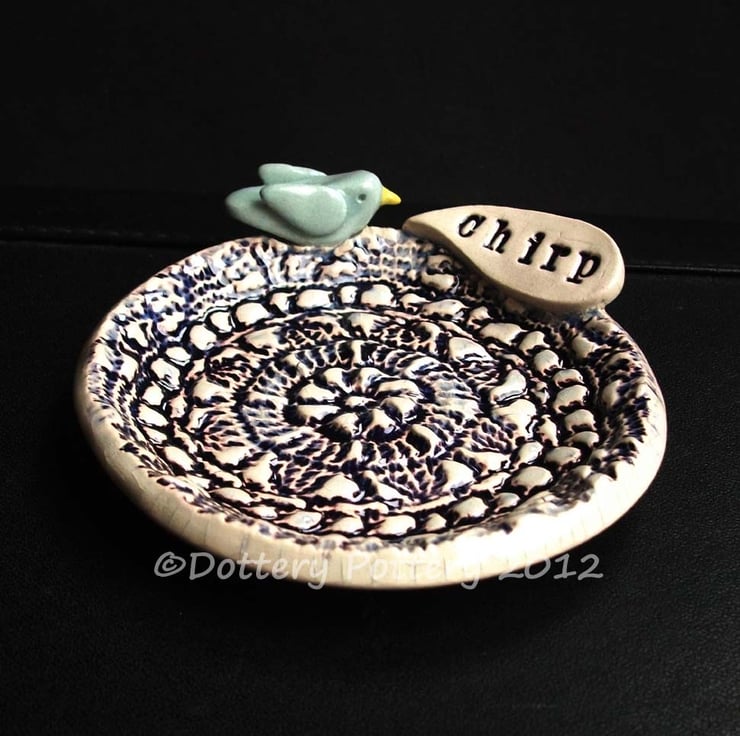 This cute little dish is made from white earthenware clay and decorated with a little blue bird and a speech bubble with the word chirp.