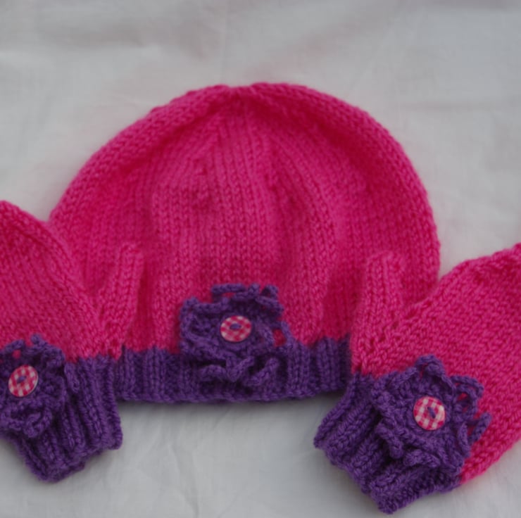A very cute Toddler hat and mittens set hand knitted in pretty pink and purple. The little hat has a lovely adornment of a purple crochet flower with a sewn on checked pink and white button centre. This detail has been duplicated on the backs of the little pair of mittens. Pink is the main colour in this set with a purple edging. This set is hand knitted in easy care soft Acrylic yarn so can be machine washed up to 40%.