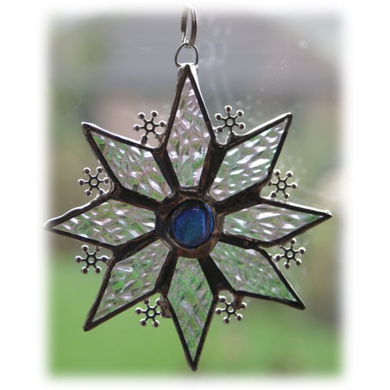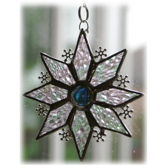 I've designed it with 8 diamond shaped points made from iridescent clear glass and at the centre an intense blue coloured dichroic glass nugget which I made in my little Hotpot fusing kiln.
