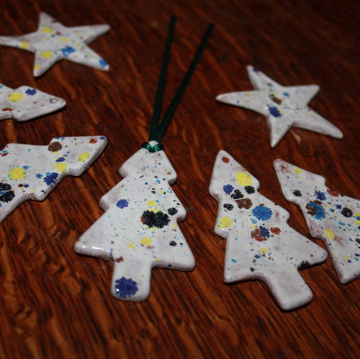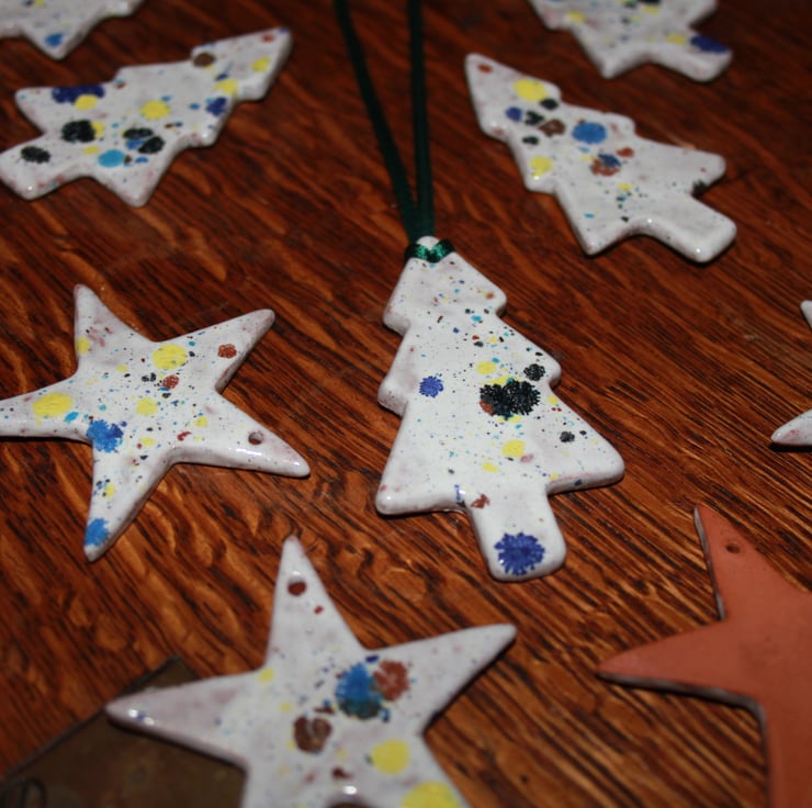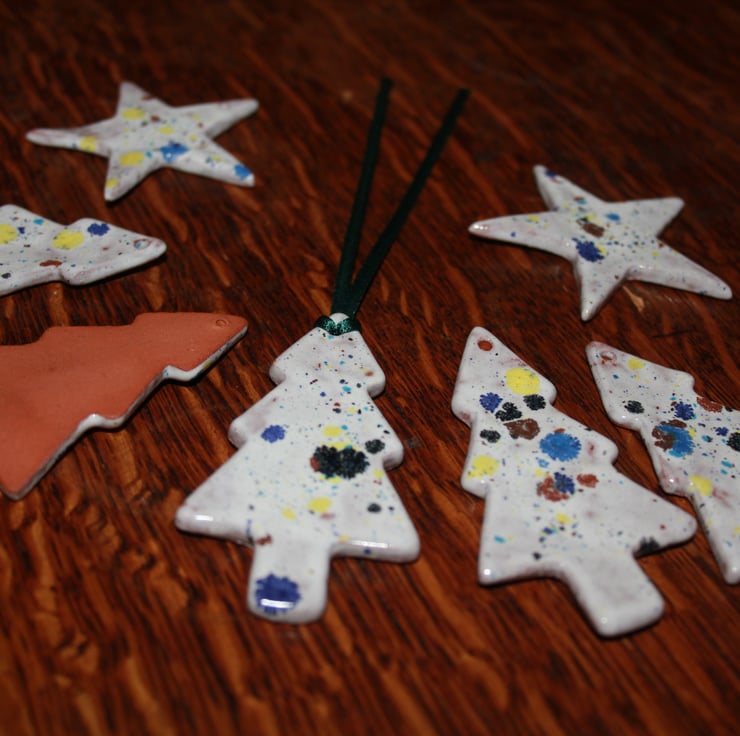 Terracotta clay handmade ceramic konfetti glaze hanging decoration, terracotta clay has been rolled out into slabs, tree shape cut out, then bisque fired & then glaze applied & fired again. not glazed on the back. some terracotta clay body showing through glaze.