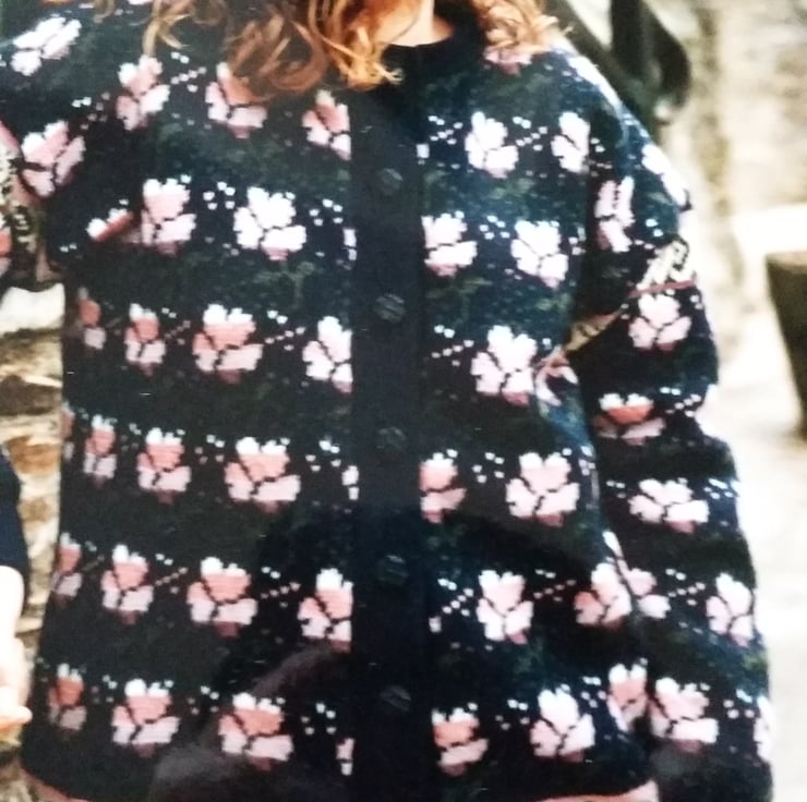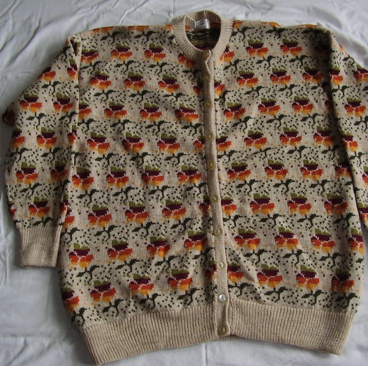 Oatmeal button to the neck cardigan with a flower design all over it in Autumn shades of mustard, copper, wine and green. This cardigan is made from machine washable wool. It is made to measure to order and can be made in any other colour combination.