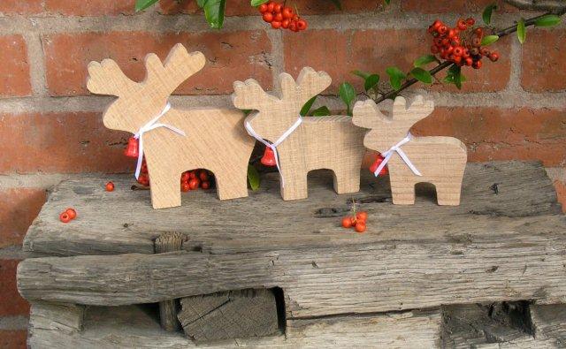 A beautiful set of Reindeer made from reclaimed wood with a rustic appearance. White ribbons with red bells have been added around their necks.