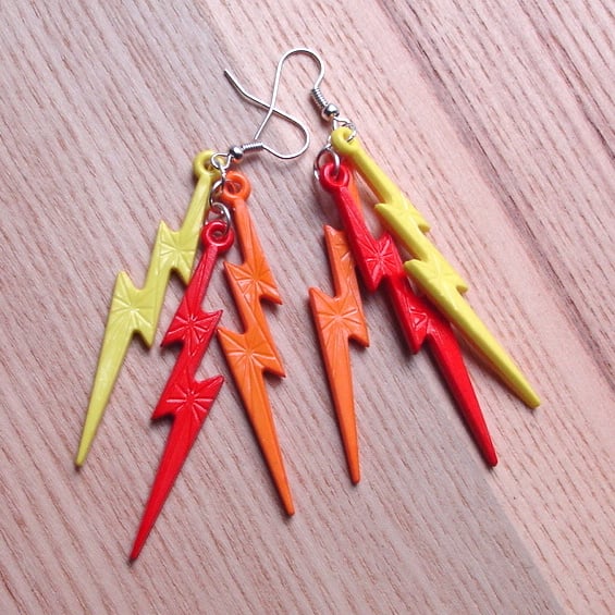 These stunning earrings feature vivid and fun plastic lightning bolt charms. They are hung off silver plated rings and silver plated earwires. Really bold, lightweight and fun to wear.