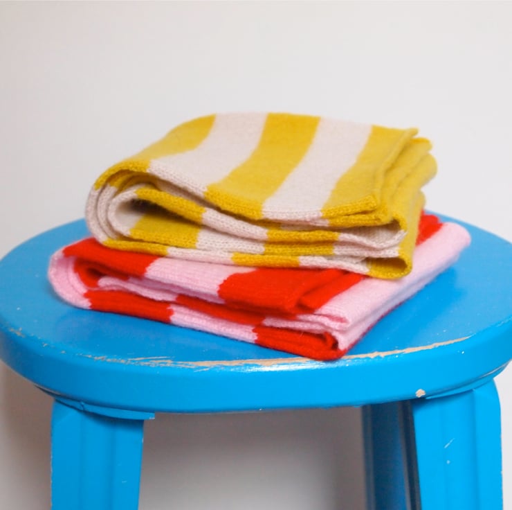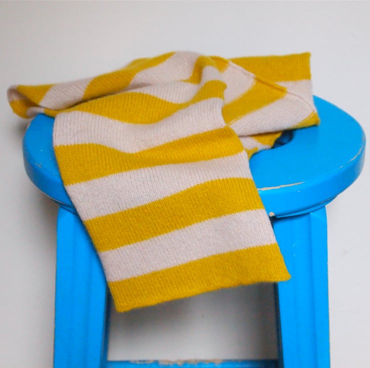 Golden Yellow and Beige stripe children's scarf. This scarf is knitted on my hand powered knitting machine with 100% British lambswool.