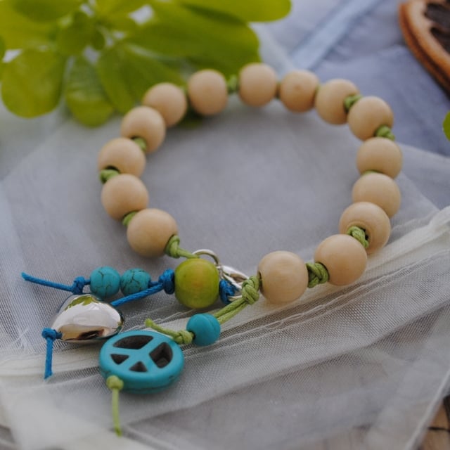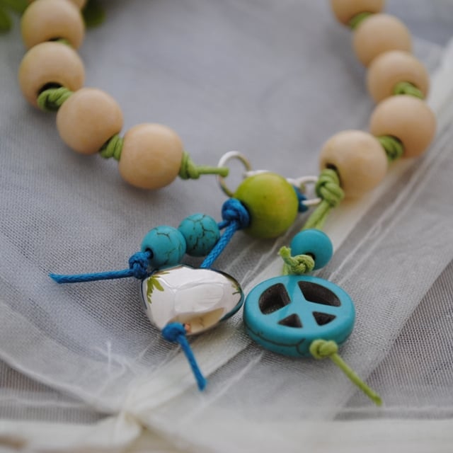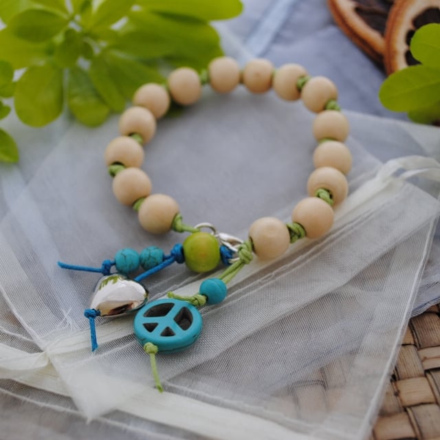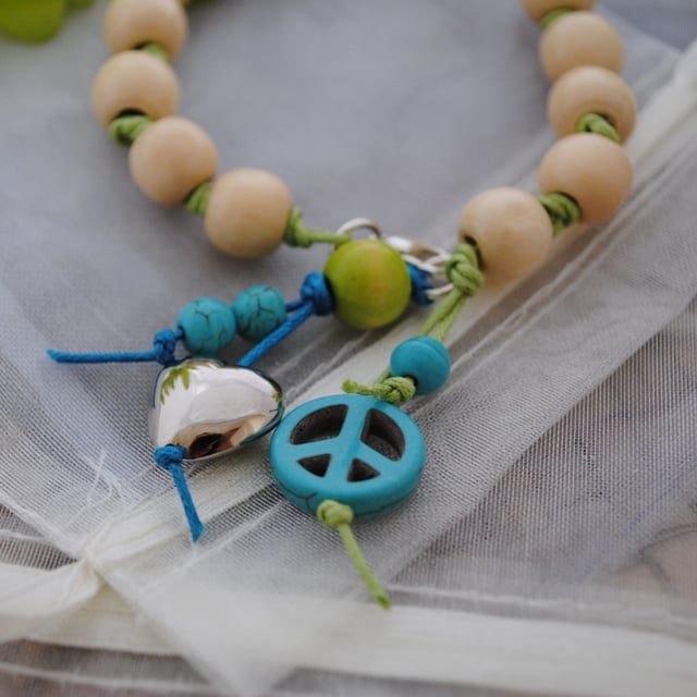 Bracelet made with natural wood beads on hand-knotted lime green cord. The bracelet features a charm dangle made with semi-precious howlite turquoise peace bead, a shiny silver heart and natural turquoise beads.