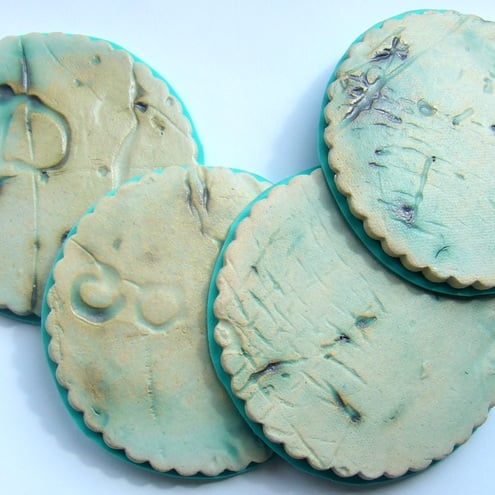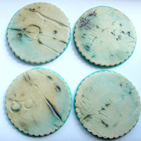 The edges of the coasters are 'frilly', and each one has a mint green circular piece of foam on the bottom to prevent scratching the surface of your table and to stop them moving around.