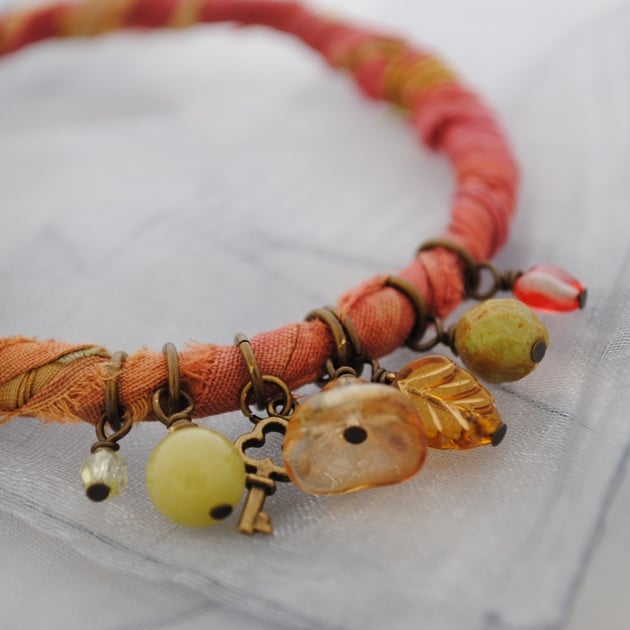 The beautiful colours in the sari silk are complemented by the selection of bead charms. This piece is extra special as the silk is sourced from Women's co-operatives in India and Nepal.