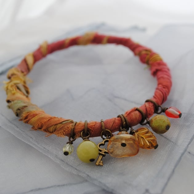 Unique and unusual bangle bracelet made with sari silk with bead charms. The bangle has been created by wrapping the sari silk around a handmade bangle base.