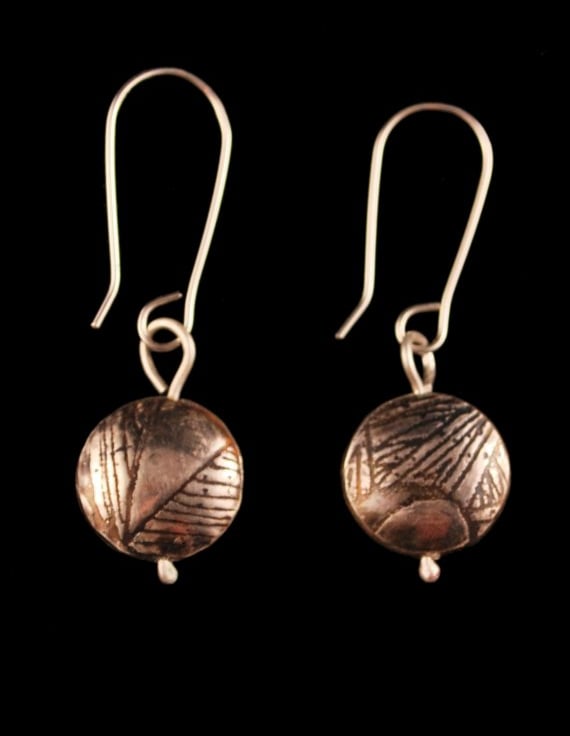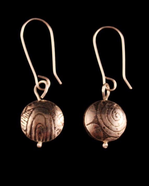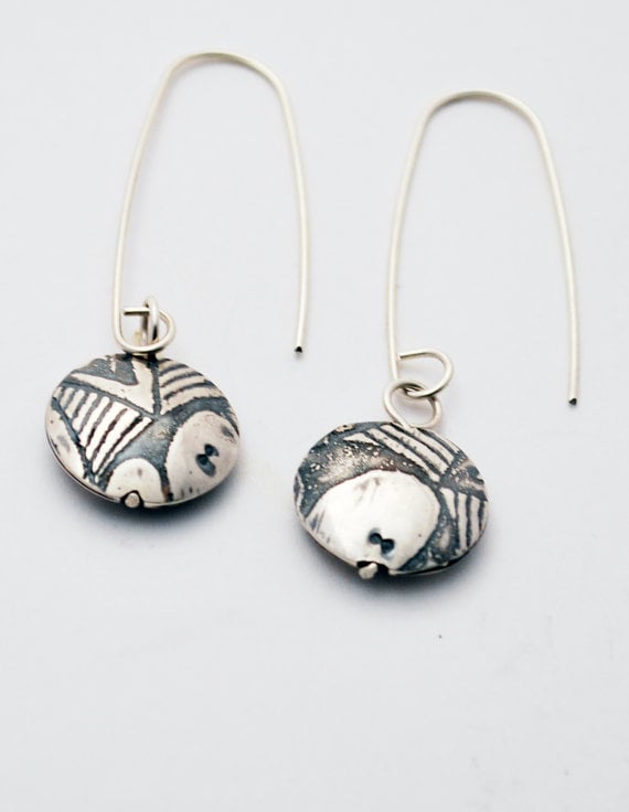 These sterling silver capsule drop earrings have had an etched design impressed into the surface from steel plate, etched by myself using environmentally friendly processes. I produce designs by hand or digitally and transfer these onto metal using modern etching techniques. The silver capsules have been patinated and treated to protect the patination.