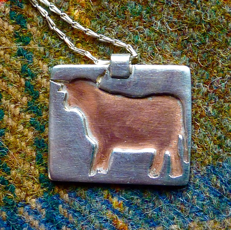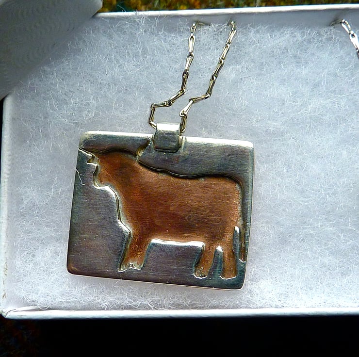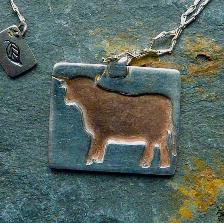 This listing is for a dainty Highland cow pendant in copper and silver. The unusual silver chain has two fittings so that you can wear it as a choker or at the breastbone. The clasp features a tiny little rectangle stamped with a leaf.