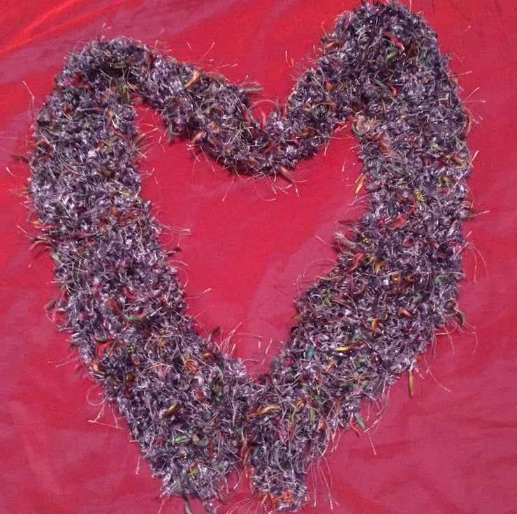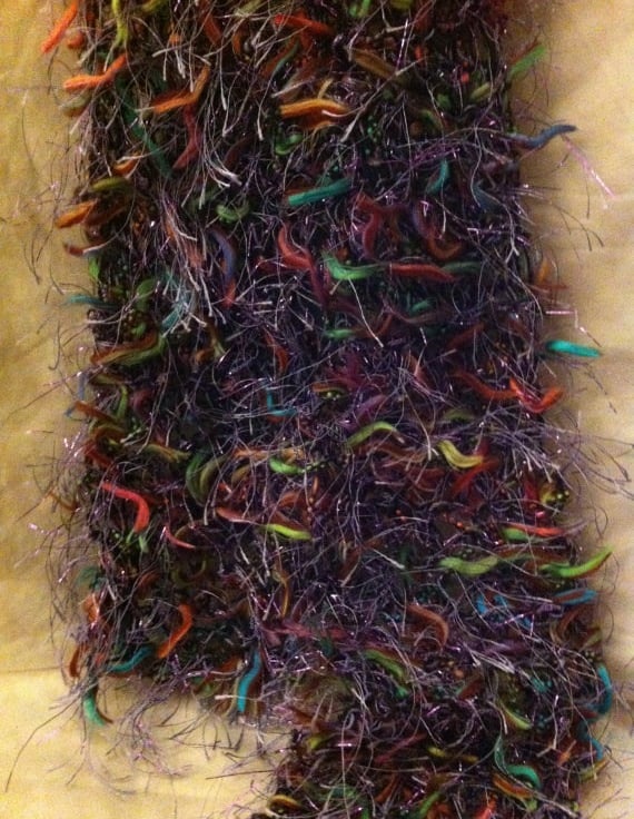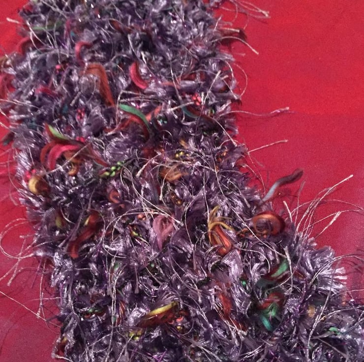 Beautiful knitted peacock coloured ribbon scarf, hand wash only. Scarf is 150xm in length and 10cm wide.
