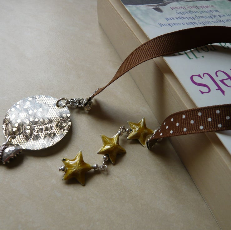There are 3 small yellow/gold stars at one end and at the other a glittery acrylic disc with a tibetan style butterfly which I have used before in some of my earrings