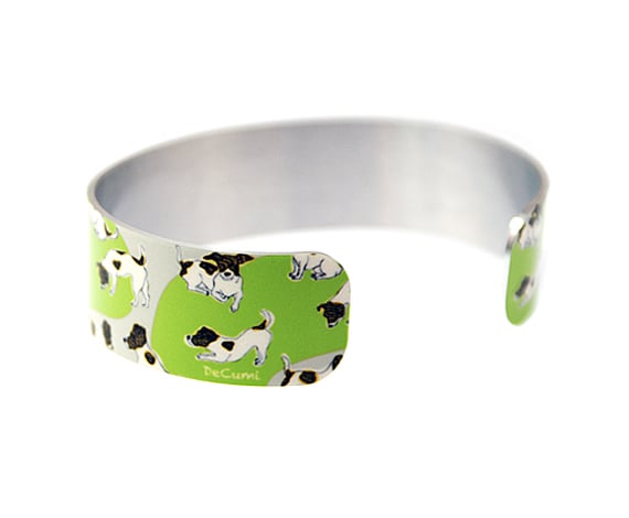 Bangle bracelet with hand drawn dogs. Jack Russell jewellery cuff with green and grey background and playful puppies. ideal dog lovers gift.