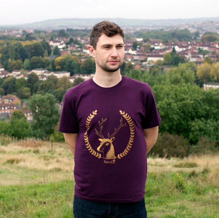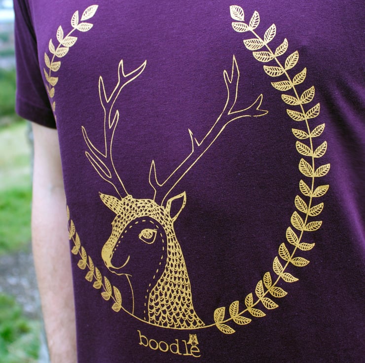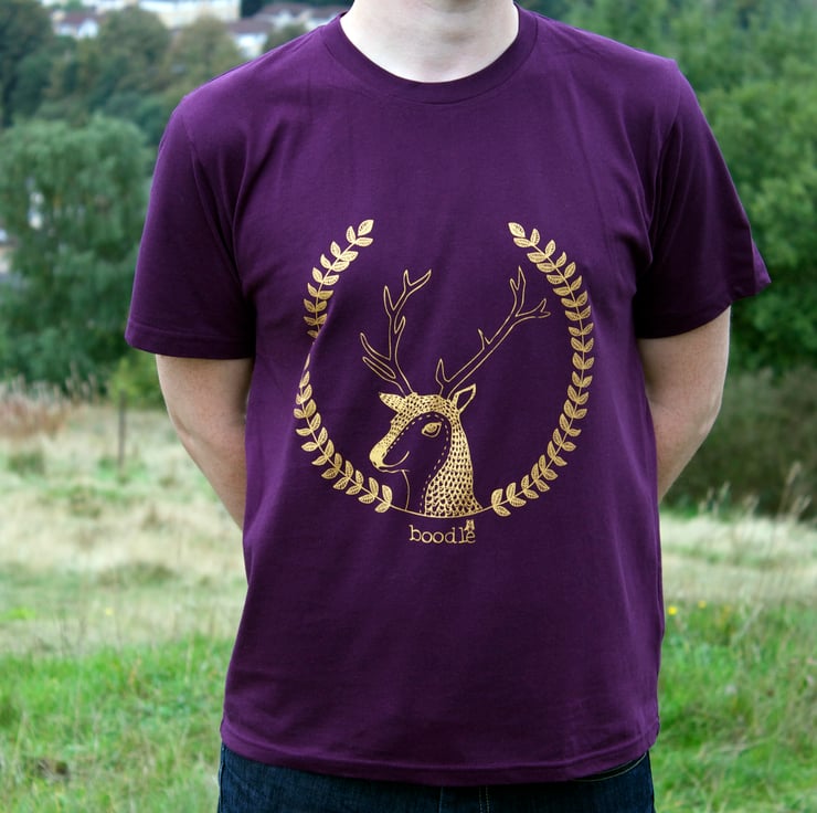 'Simon the Stag' is hand screen printed with gold ink onto lovely organic cotton with eco-friendly inks.