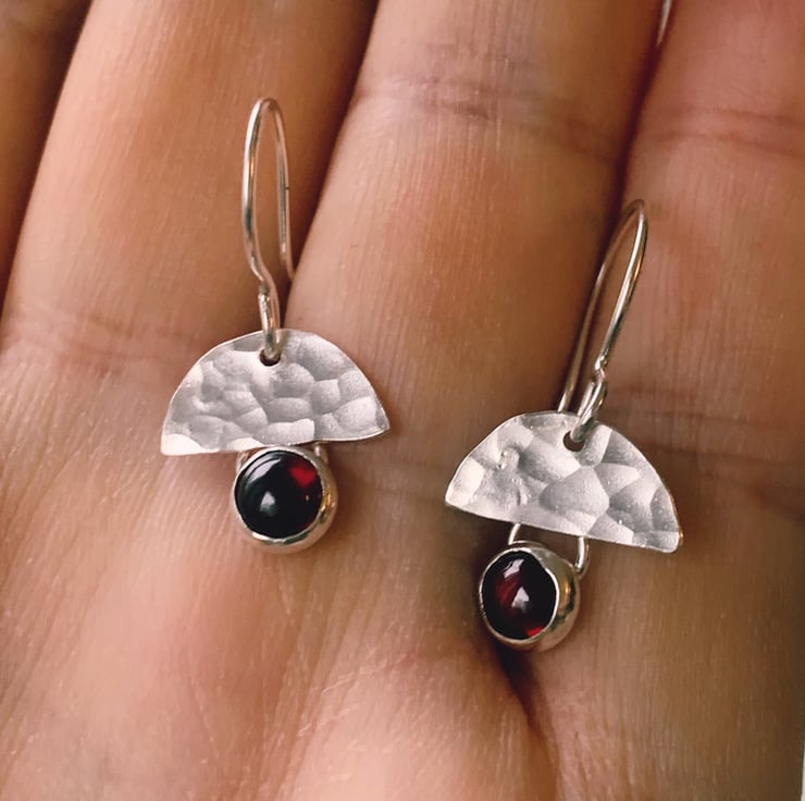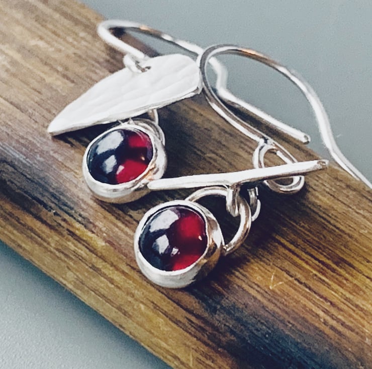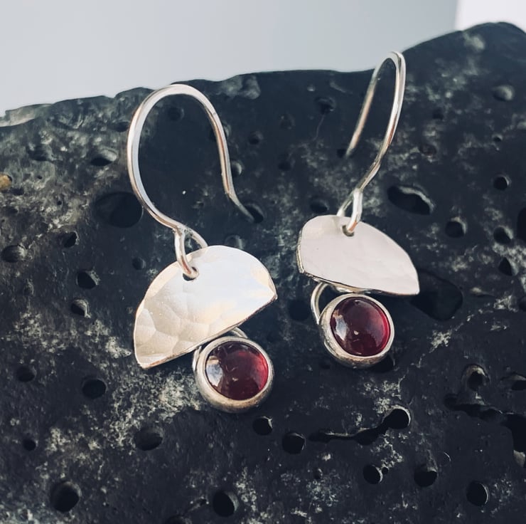 Hammered textured drop earrings with garnet 5 mm cabochon droplets